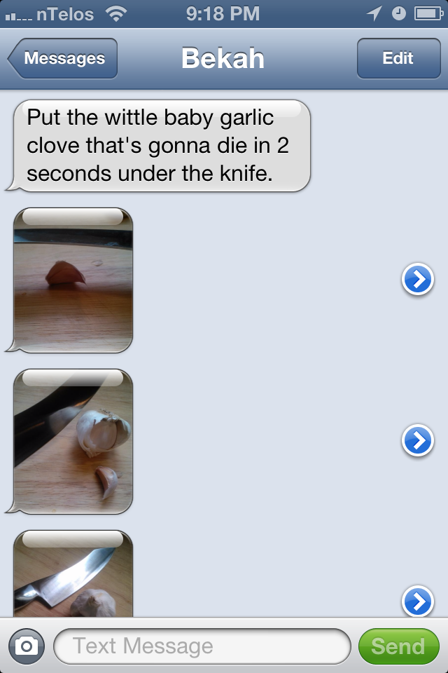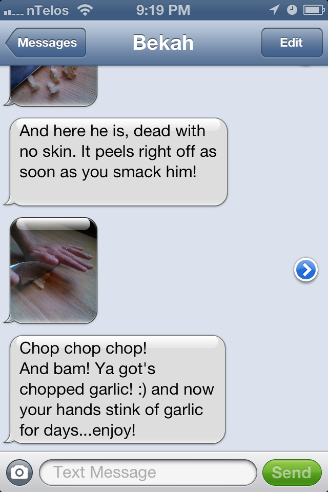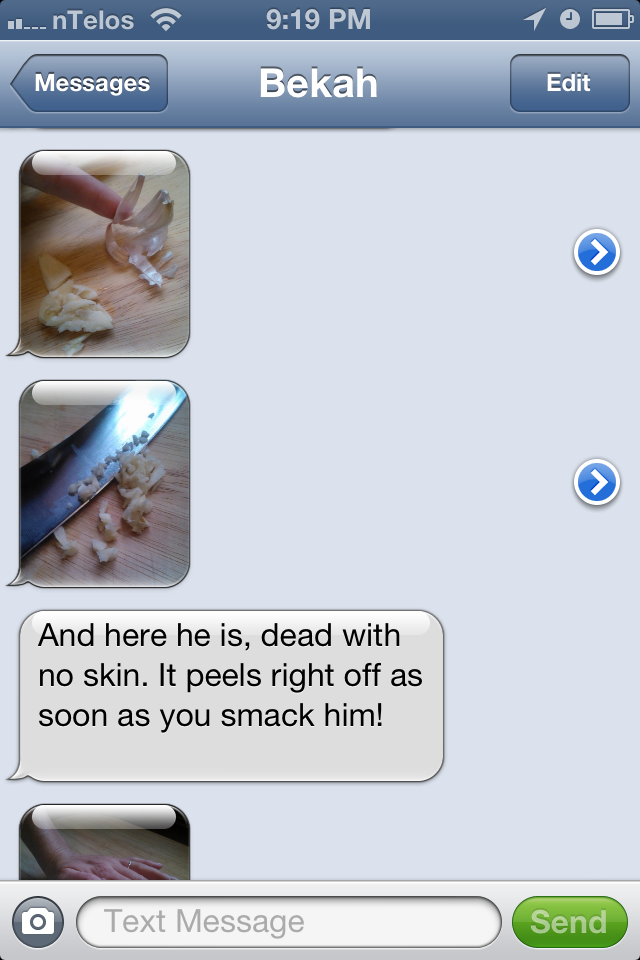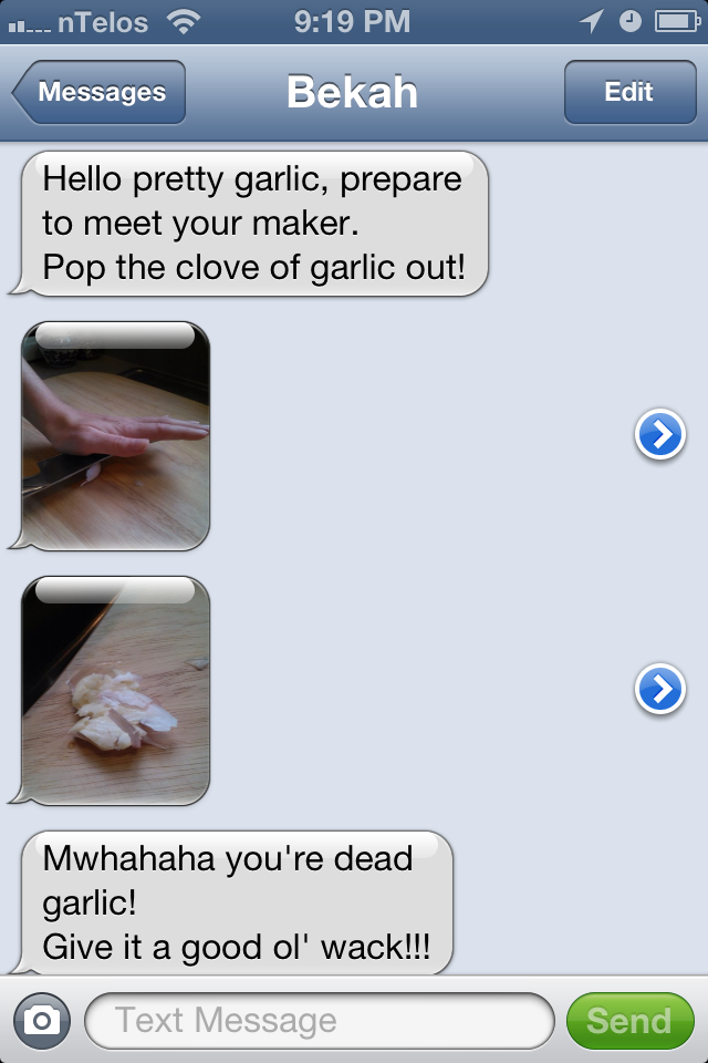 So after she finishes laughing at my stupidity, or perhaps blissful ignorance, she then texts me a hilarious demonstration of how to properly slaughter the garlic into useable cooking material. I have included her how-to guide at the end of this for your entertainment. haha She’s going to kill me. Much like she did the garlic. LOL