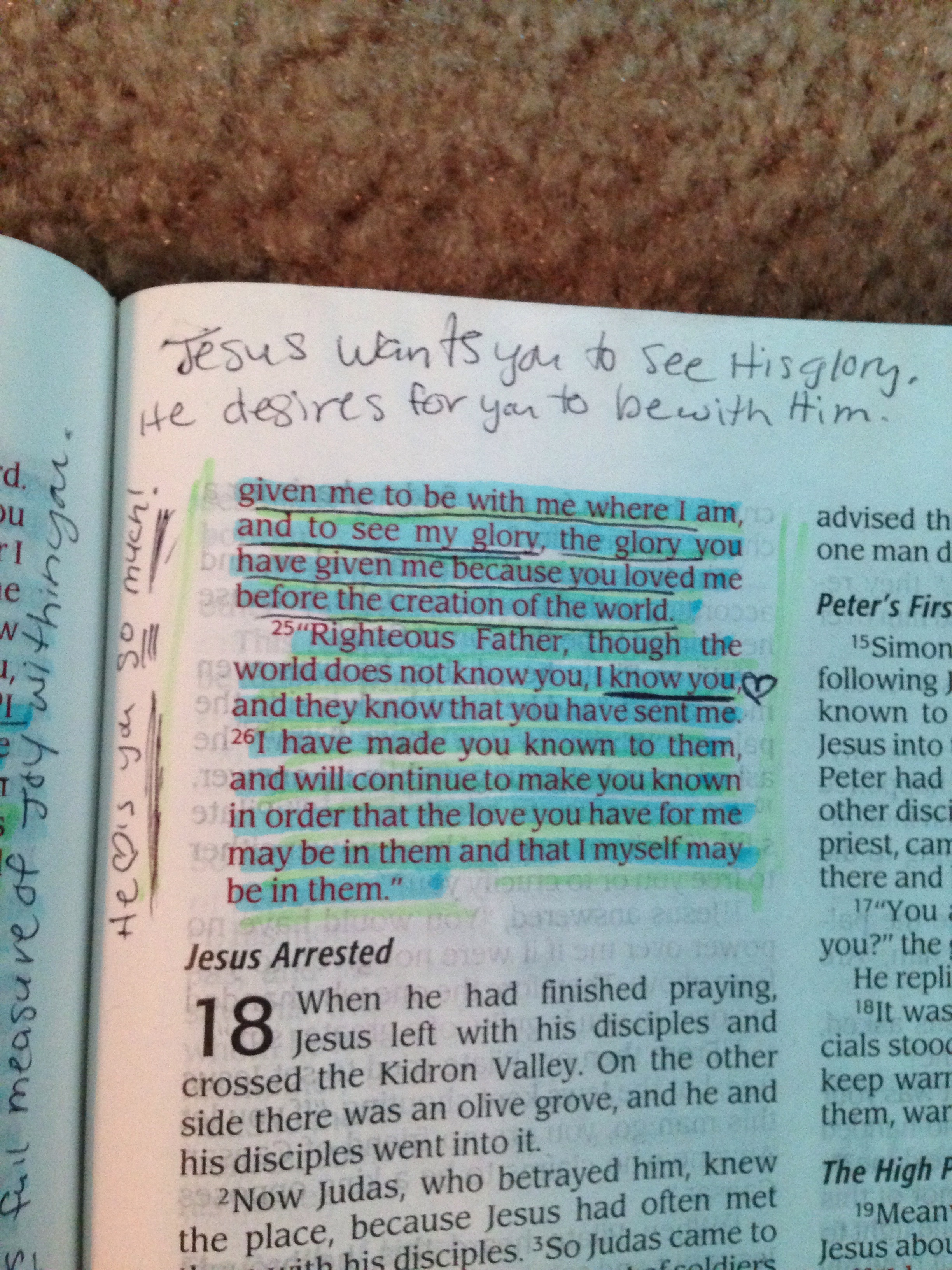 Lastly, Jesus prays for all believers. His beloved children. He wants us all to be unified and connected. He wants the world to know we are loved by God. This part I am so in love with – Jesus wants us to be with him and he wants us to see his glory. Remember Moses on the mountain? He saw the glory of God and his face glowed from being in the presence of His glory! Have you experienced the glory of God?