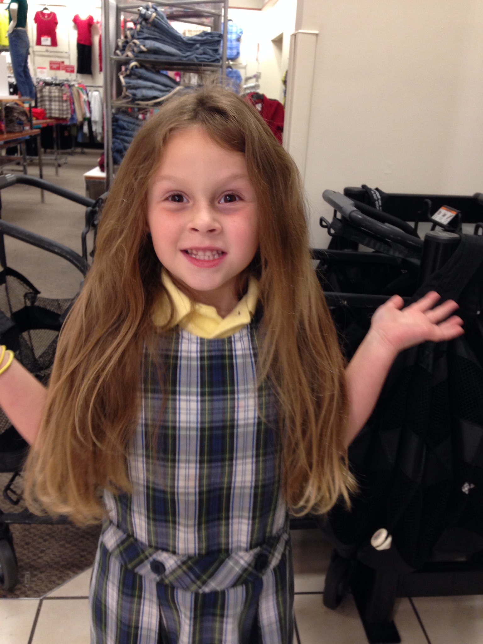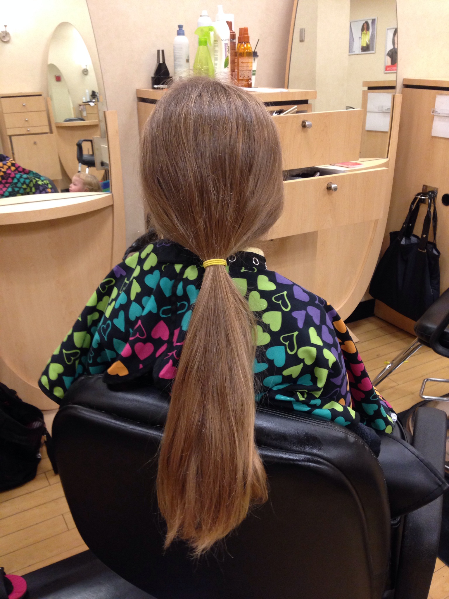 For months she has been growing her hair out. This picture was taken right before we walked into the salon. I had already straightened her hair at home and measured it.