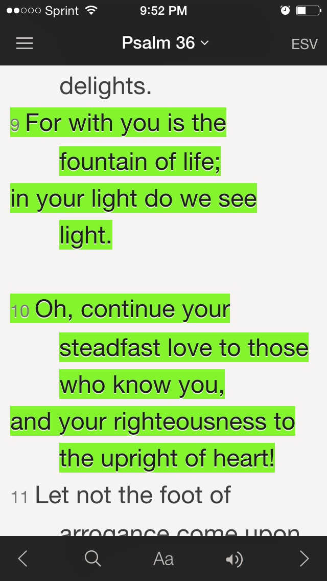 Verses 9-12: The “fountain of life” .. what an awesome picture of who God is. In Jeremiah 2:13 God is called the fountain of living waters. I find myself closing my eyes and seeing this beautiful waterfall flowing down wanting nothing more than to stand under the flow. God’s love, mercy and grace is refreshing and cleansing to our very soul.