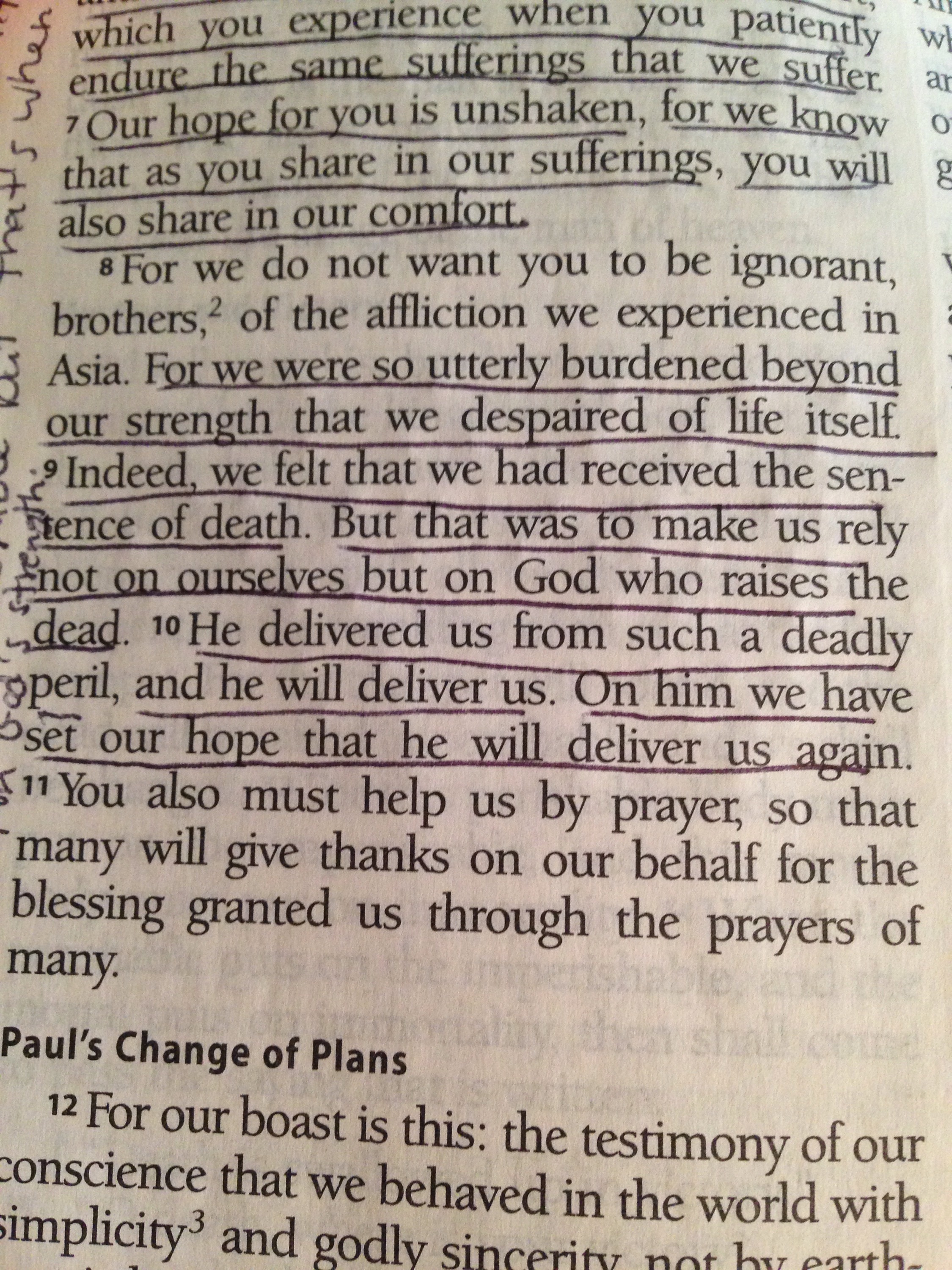 “..for we were so utterly burdened beyond our strength that we despaired of life itself. Indeed, we felt that we had received the sentence of death. But it was to make us rely not on ourselves but on God who raises the dead.” 2 Corinthians 1:8-9