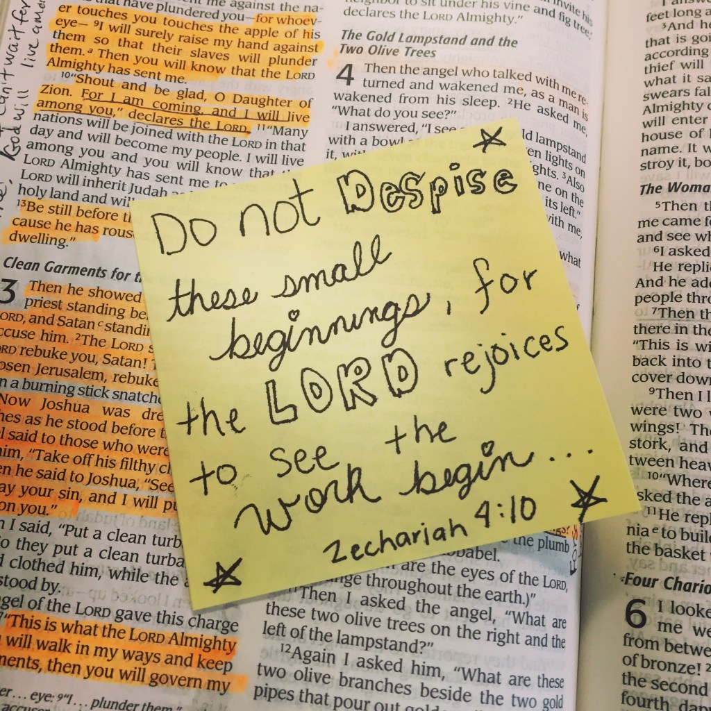 “Do not despise these small beginnings, for the LORD rejoices to see the work begin..”